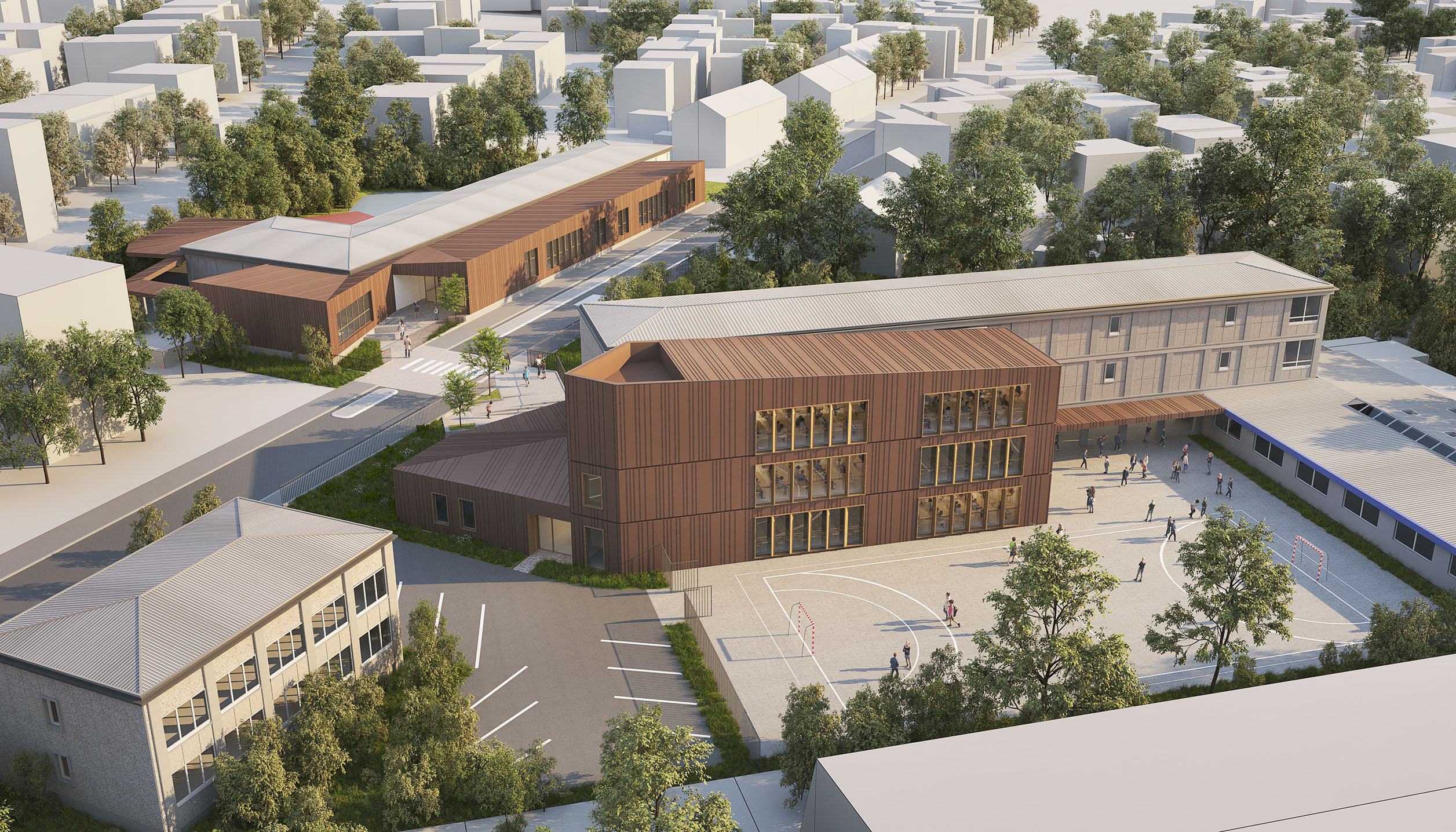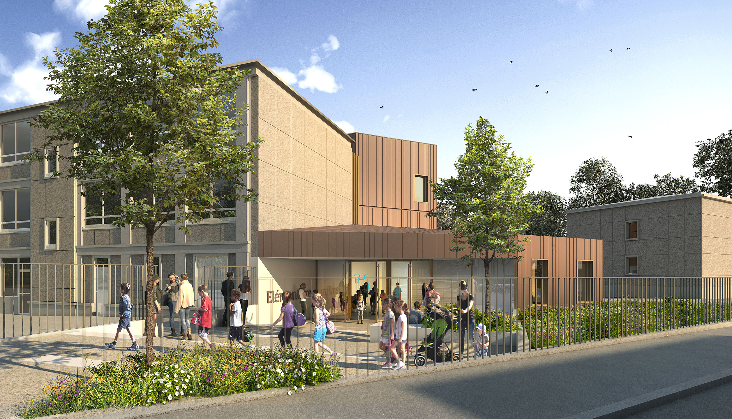 Un parvis sécurisé est aménagé dans le prolongement du passage piéton. Des rangées de bancs permettent l’attente des parents. Un large auvent abrite les accès au hall. Pour permettre cet aménagement, le local poubelle a été déplacé en pignon Ouest face à l’allée des roses. Cette localisation facilite la maintenance en assurant un accès de plain pied des containers avec le bâtiment et la voierie. En plaçant les extensions côté rue, le projet conserve les surfaces de jeux extérieurs à l’arrière. Le préau est placé dans le prolongement de la salle d’activité n°1 jusqu’en limite mitoyenne de fond de parcelle. Des gradines y sont aménagés transformant ainsi l’espace en scène de spectacle.
