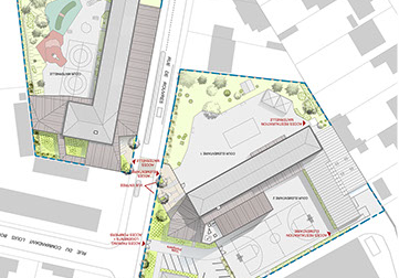 Un parvis sécurisé est aménagé dans le prolongement du passage piéton. Des rangées de bancs permettent l’attente des parents. Un large auvent abrite les accès au hall. Pour permettre cet aménagement, le local poubelle a été déplacé en pignon Ouest face à l’allée des roses. Cette localisation facilite la maintenance en assurant un accès de plain pied des containers avec le bâtiment et la voierie. En plaçant les extensions côté rue, le projet conserve les surfaces de jeux extérieurs à l’arrière. Le préau est placé dans le prolongement de la salle d’activité n°1 jusqu’en limite mitoyenne de fond de parcelle. Des gradines y sont aménagés transformant ainsi l’espace en scène de spectacle.